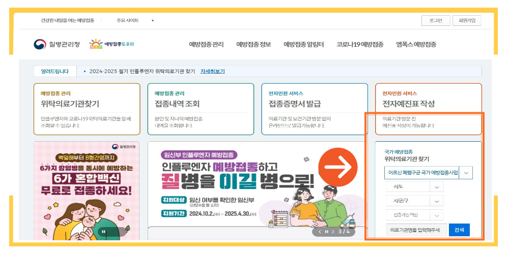 - 질병관리청 예방접종 도우미 홈페이지에서 무료 접종 가능한 의료기관 확인